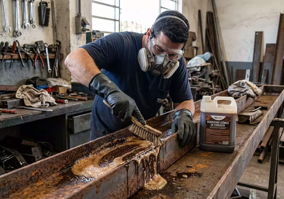 Quando a ferrugem já tomou conta ou você quer um resultado rápido e duradouro, produtos químicos são a melhor escolha. Removedores comerciais dissolvem a ferrugem — basta aplicar, esperar o tempo indicado e esfregar.