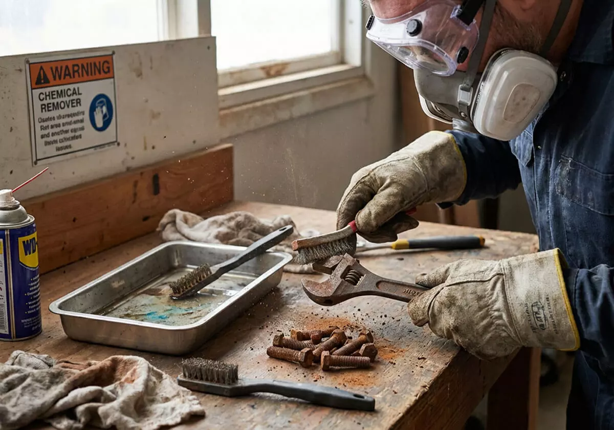 Esses materiais ajudam a remover ferrugem em diferentes níveis e tipos de superfícies. O uso de EPIs é fundamental, principalmente ao lidar com produtos químicos. Não arrisque sua saúde: sempre proteja mãos, olhos e vias respiratórias enquanto trabalha com soluções químicas ou faz atrito intenso.